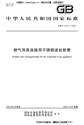 燃氣用具連接用不銹鋼波紋軟管GB/T 41317-2022:本文件規(guī)定了使用GB/T 13611規(guī)定的城鎮(zhèn)燃氣的燃氣用具連接用不銹鋼波紋軟管的分類、規(guī)格和型號,要求,試驗方法,檢驗規(guī)則以及標志、包裝、運輸和貯存。