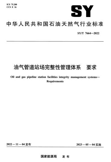 SY/T 7664-2022 油氣管道站場完整性管理體系 要求:本文件規(guī)定了油氣管道站場構(gòu)建完整性管理體系的基本要求,用于指導(dǎo)企業(yè)建立站場完整性管理體系,實施完整性管理工作,提高設(shè)備設(shè)施安全性,可靠性、經(jīng)濟(jì)性運行水平,持續(xù)改進(jìn)管理績效。